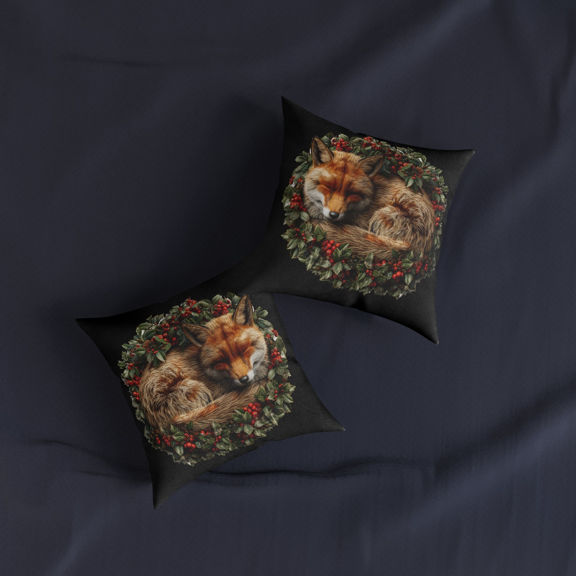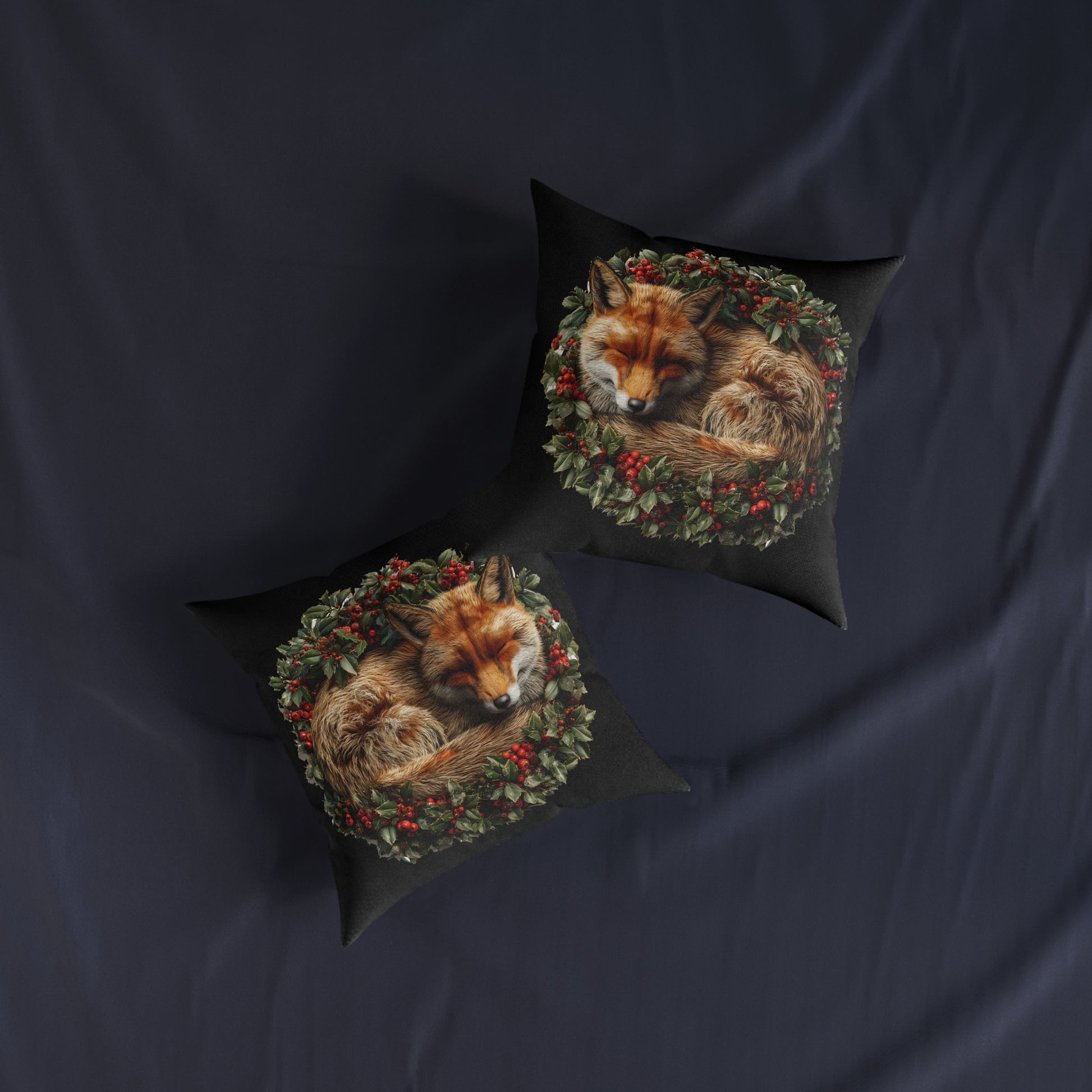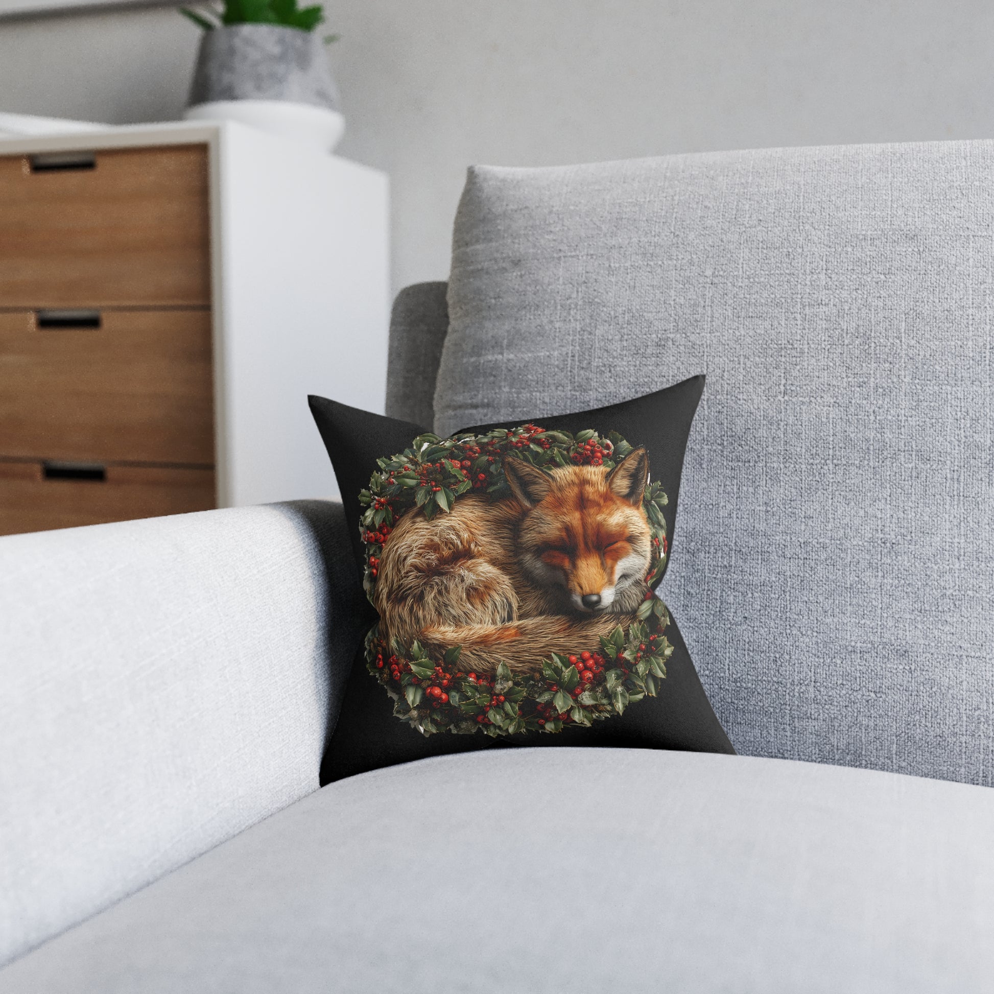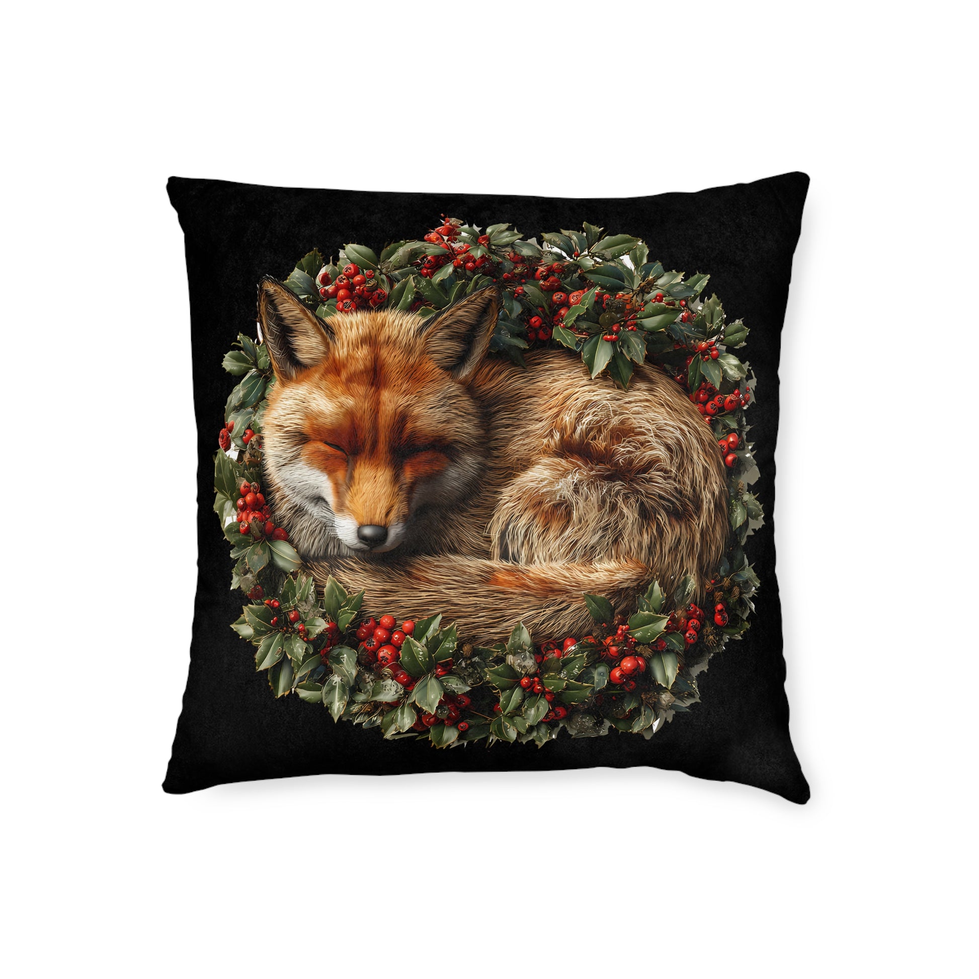 A Christmas Fox Laying in a Holly Wreath